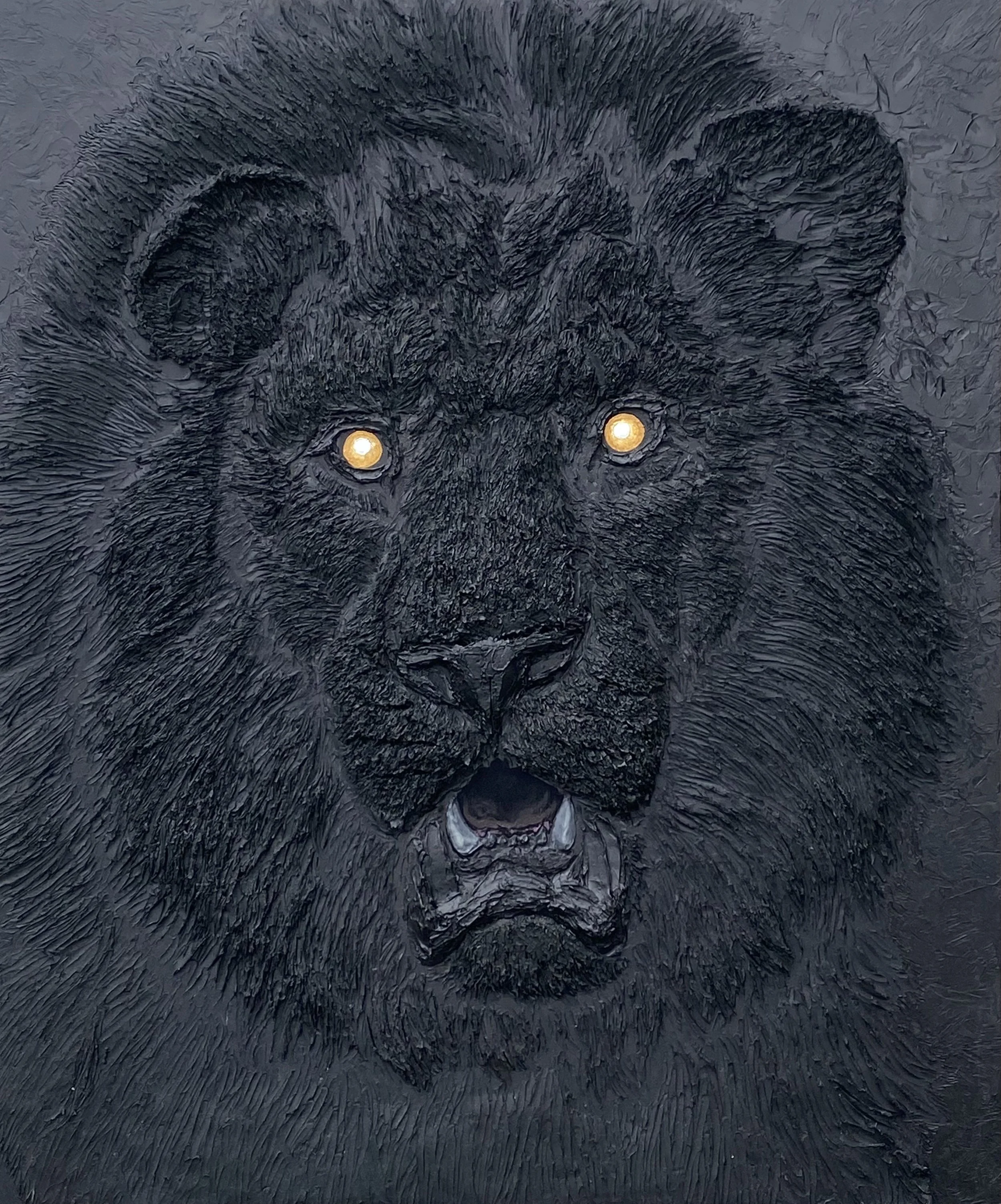 As we Descend in Our Dreams we Silently Scream, 2024. Oil on Panel - 24 x 24 inches. This painting captures the silent anguish that lingers beneath the surface of consciousness. Sculpted in dense, black oil, a lion’s open mouth stretches into a soundless roar — its textured form nearly swallowed by darkness, while the interior of its mouth reveals an unexpected dreamscape of soft, iridescent colors. The tension between the restrained surface and the vivid interior evokes the human experience of suppressed fears and unspoken grief. As We Descend in Our Dreams We Silently Scream invites viewers to contemplate the quiet battles fought within, where pain and resilience coexist in silence.