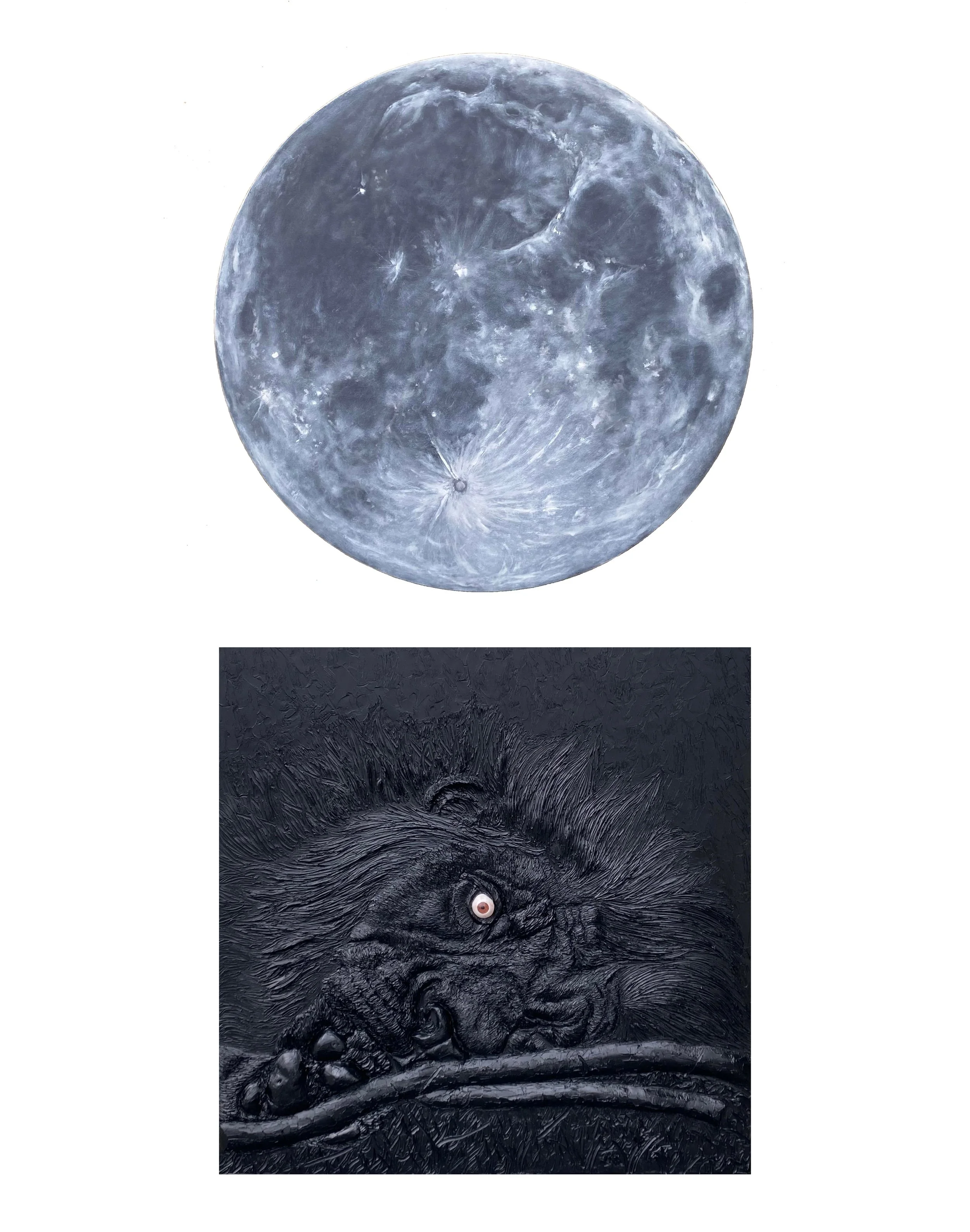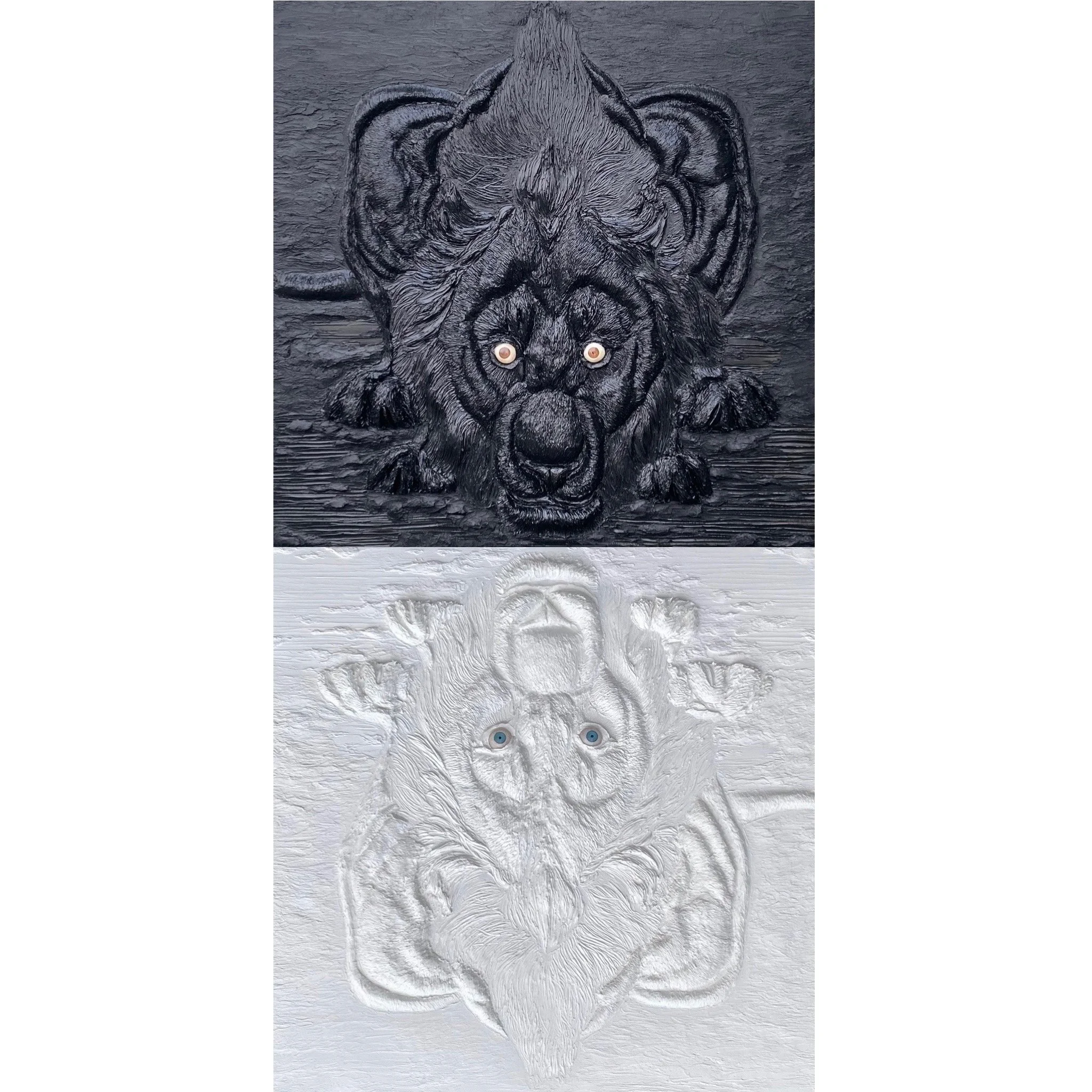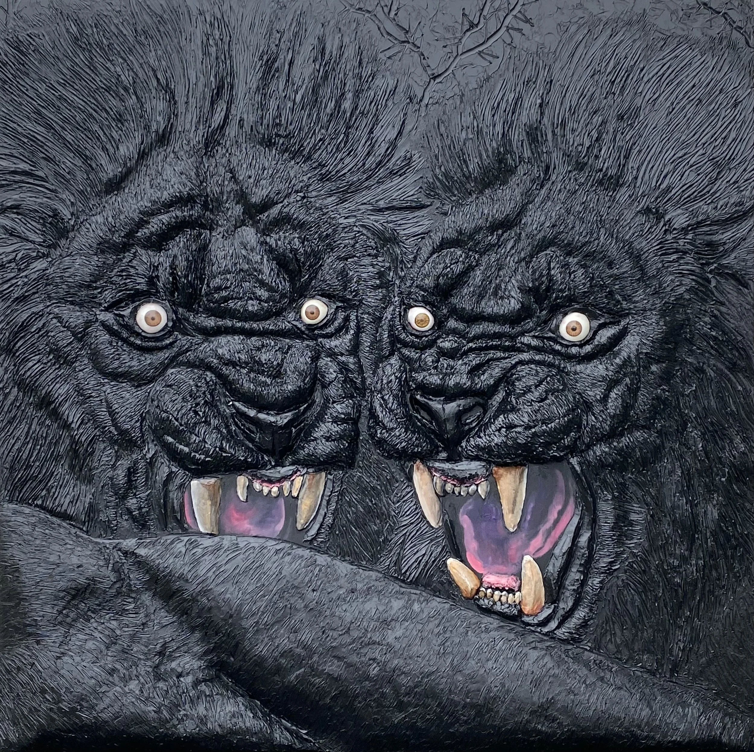THE PARADOX OF SEEING ANOTHER PERSPECTIVE, 2025. Diptych. Oil and prosthetic eyes on panel. Contrast One: 24 x 24 inches. Contrast Two: 24 x 24 inches. This work interrogates the entrenched systems of perception that cultivate closed-mindedness and resistance to alternative perspectives. By splitting the composition into dualities of black and white—visibility and invisibility, presence and absence—the piece destabilizes singular ways of seeing. The lion’s doubled visage, rendered in both shadow and illumination, becomes a metaphor for the multiplicity of realities that exist beyond a singular worldview.