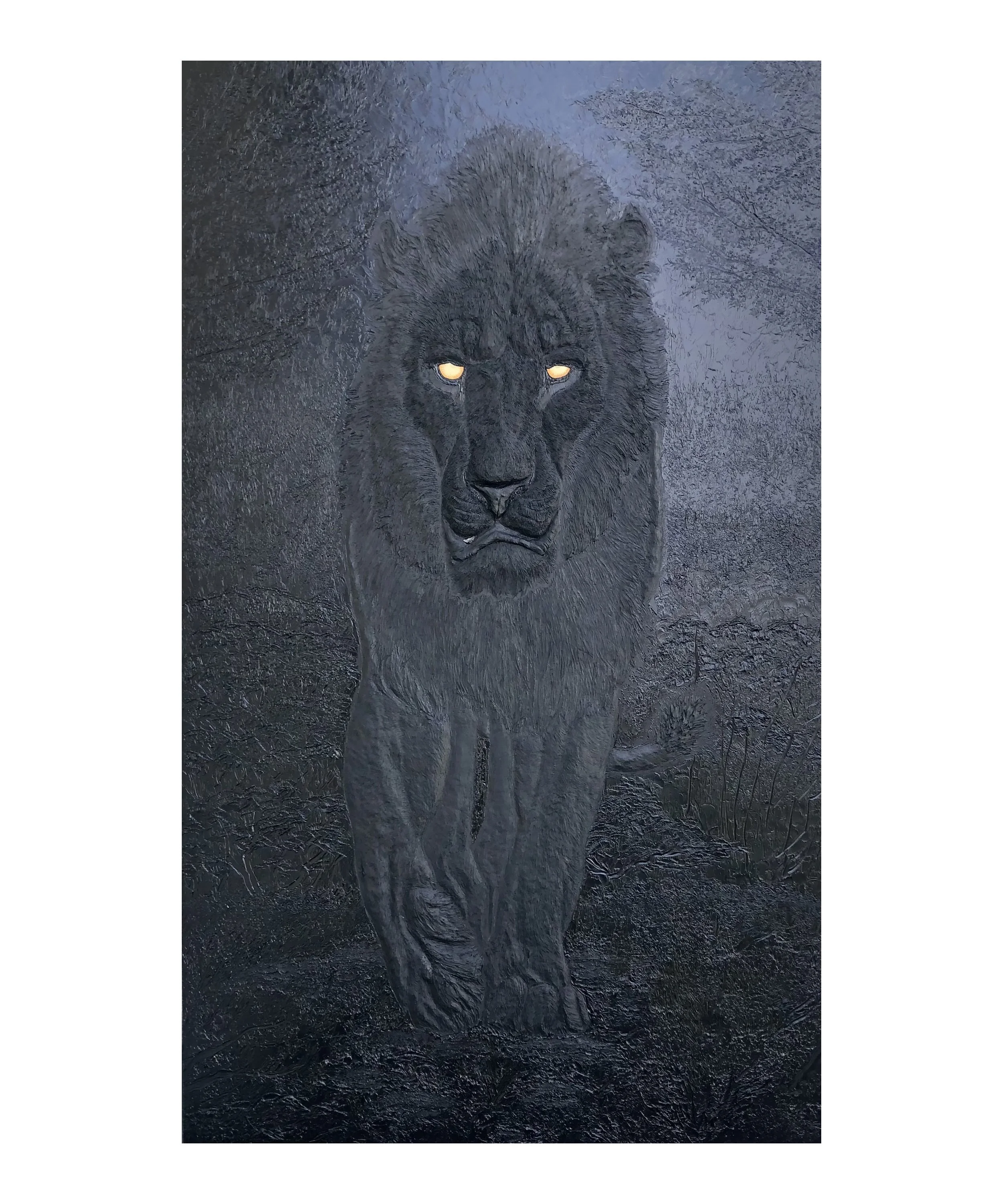 Stand Tall, 2023. Oil and gold leaf on canvas - 48 x 72 inches. Stand Tall serves as a visual homage to the survivors of historical atrocities — individuals who endured profound suffering and yet passed down strength, wisdom, and resilience. Rendered in textured black oil, a lone lion stands upright against a ghostly landscape, its gaze unwavering, its form emerging from mist and memory. The luminous eyes symbolize an inner light that persists despite hardship. As a companion piece to Zanzibar’s Gateway, this work honors the living legacy of those who overcame, reminding viewers that dignity and fortitude are woven into the lineage of survival.