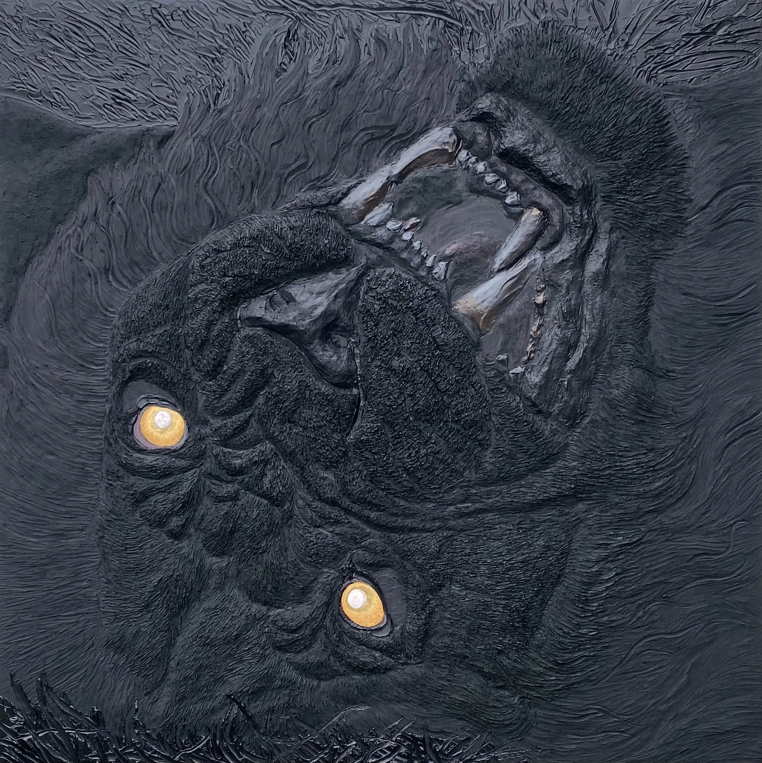 Vertigo, 2024. Oil and gold leaf on panel - 24 x 24 inches. Vertigo is a visceral meditation on the disorientation, anxiety, and internalized violence bred by the pressures of the contemporary urban landscape. At its center is a lion—feral, inverted, and fragmented—its luminous eyes confronting the viewer. The intense black impasto envelops the form, its swirling textures echoing the chaos and instability of navigating systems that press down on the soul. The inversion of the lion evokes a sense of imbalance and loss of control, while the glowing eyes remain unnervingly alert—signaling a state of hyper-vigilance familiar to those who live under constant psychological pressure. The raw exposure of the lion’s teeth and throat becomes symbolic of both threat and vulnerability. Through Vertigo, Moore captures the suffocating tension of surviving in modern cities where survival is not only physical but psychological. The piece transforms the lion from a symbol of power into an embodiment of inner turmoil, echoing the experience of individuals forced to remain upright in systems built to induce collapse. It is a visual poem of survival amidst destabilization.