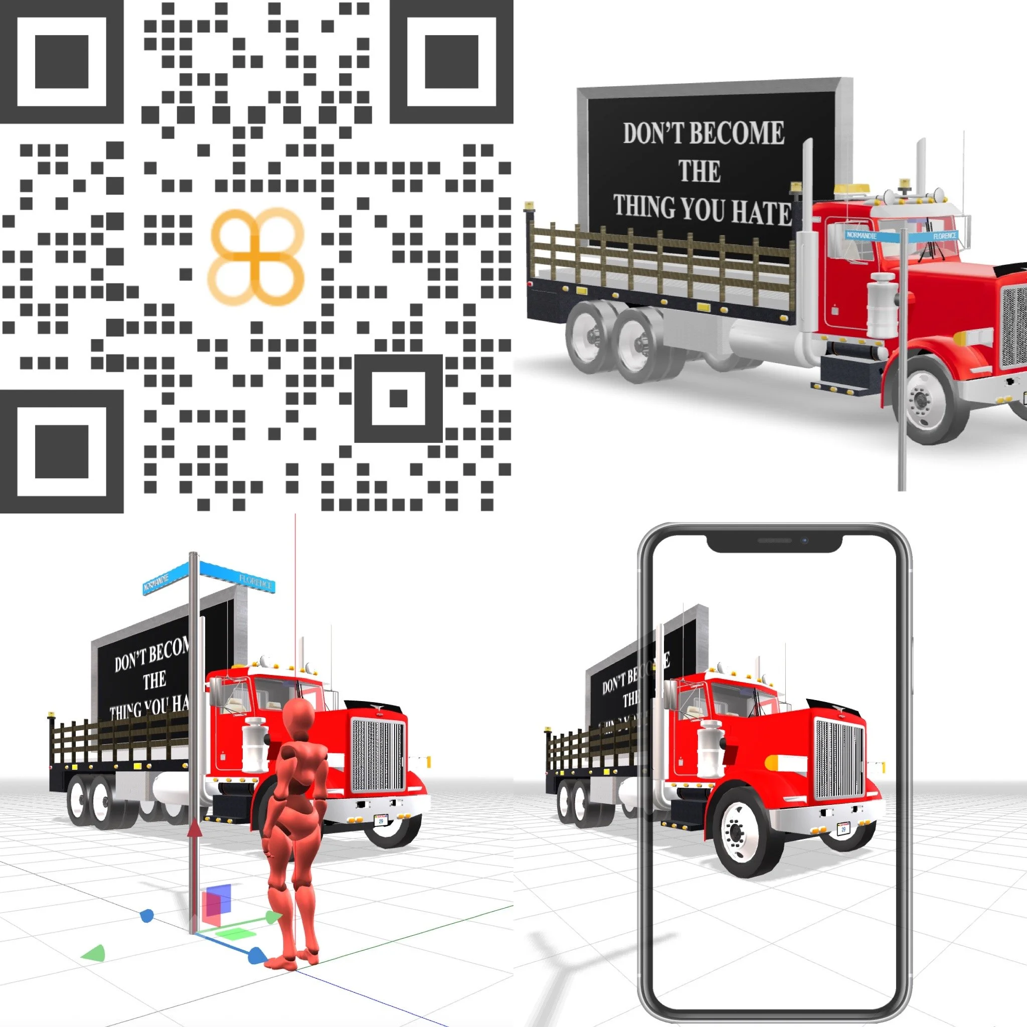 Introspective Intersection, 2024. Description: Introspective Intersection revisits a pivotal moment in American history: the 1992 Los Angeles Uprising. This augmented reality experience digitally recreates a truck similar to the one driven by a victim at the intersection of Florence and Normandie. On its bed, a stark billboard bears the message “Don’t Become the Thing You Hate”, urging reflection on cycles of violence, anger, and transformation. Through immersive technology, viewers are invited to stand at the crossroads of past and present, confronting the emotional weight of inherited trauma and the difficult responsibility of resilience. The piece asks a simple yet profound question: in the face of injustice, what do we choose to become?. Device: Smartphone or tablet. AR Platform: Hoverlay. Required Software: iOS or Android